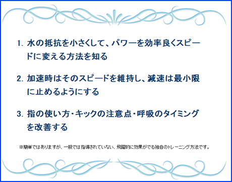 このトレーニング法は、スイマーとしての効果的なたった3つのことを意識しながらトレーニングするだけなんですよ。